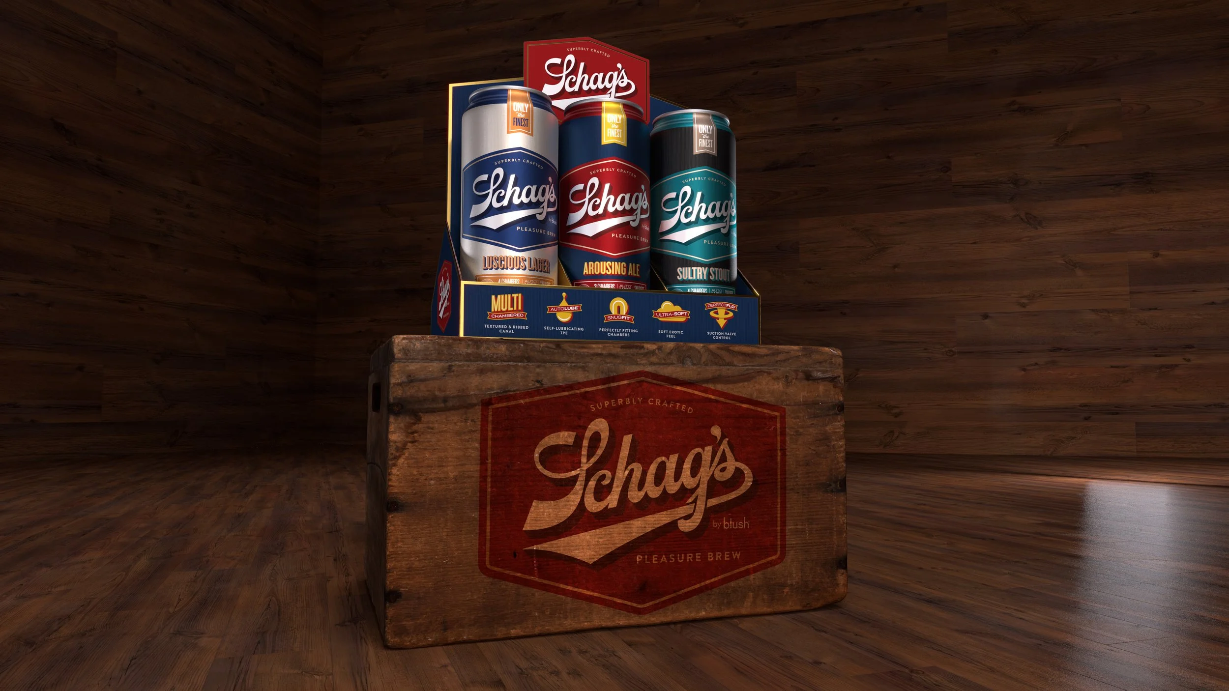 Schag’s is a very unique pleasure product as it is designed to look like a traditional beer can. With three different brews, each with beautiful striking color schemes, Schag’s quickly became an incredibly hot item in the industry. I created the brand name, logo, can design, and POP display. I also took these lifestyle photos on location at a local bar. Only the finest!